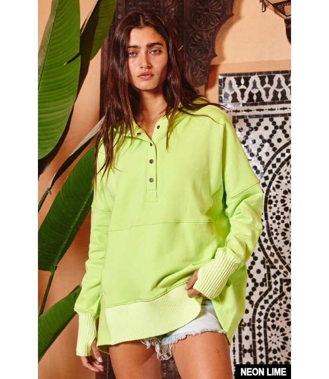 The Steph Neon Lime Oversized Hoodie turns comfort into a statement. Made from soft washed French terry, this oversized tunic-length hoodie features a button-up front, ribbed cuffs and hem, and handy side pockets—perfect for keeping your hands warm or stashing small essentials. The neon lime hue adds an energetic pop to any outfit, making it impossible to blend in. Whether paired with leggings, jeans, or joggers, Steph is your go-to for laid-back days with a fun, fashion-forward twist.
