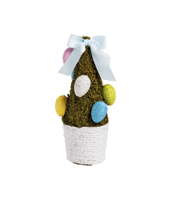 Bring springtime charm to your home with this adorable moss Easter egg tree. Featuring handcrafted cotton rope eggs atop a preserved moss topiary, nestled in a rustic paper rope basket, it adds whimsy and elegance to any tabletop, mantel, or entryway. Long-lasting and vibrant, this 10" x 3¼" piece is the perfect festive accent for your seasonal celebrations.