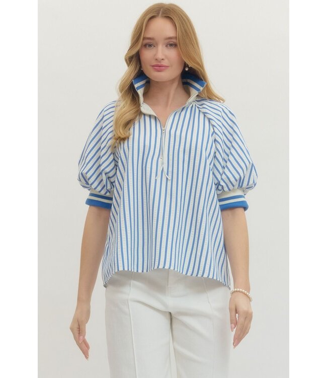 The Monica Blue Striped Top is the perfect mix of sporty and sweet. Featuring a classic stripe print, this cute little number is designed with short puff sleeves for a playful, feminine touch. The contrast ribbed collar and half-zip front add a trendy, athletic-inspired vibe, while ribbed cuffs give it a polished finish. Made from lightweight woven fabric, this non-sheer, unlined top is effortlessly comfy and perfect for elevating your everyday casual look.