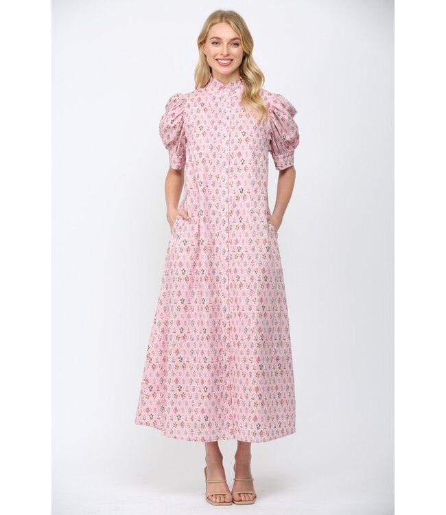 The Charrise Pink Floral Maxi Dress is a show-stopping piece for any occasion. Featuring a high ruffled mock neck, button-down front, and a soft floral print, this maxi dress flows beautifully from top to hem. Its relaxed yet elegant silhouette makes it perfect for everything from brunches and garden parties to special events.