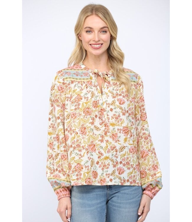 Effortlessly chic, the Ellie Cream Peasant Blouse blends boho charm with modern ease. Soft and flowy, it features a delicate border print, billowy sleeves, and a tie-neck detail for a playful, feminine touch. Perfect with jeans, skirts, or layered for a relaxed, stylish vibe.