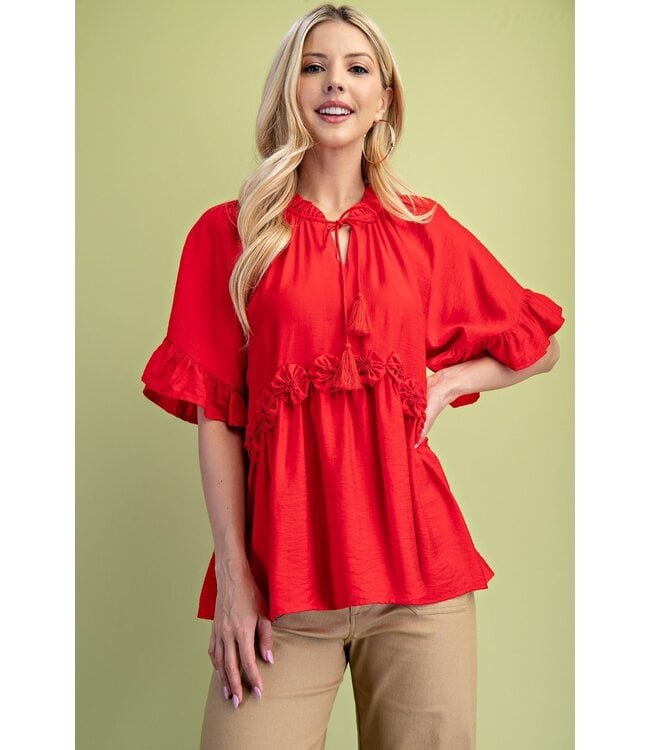 Add a touch of romance to your look with the Conner Red Tassel Top. With its tassel tie neckline, flirty ruffles, and adorable rosette embellishments, this top is as cute as it is eye-catching—perfect for brunch, dates, or casual chic vibes.