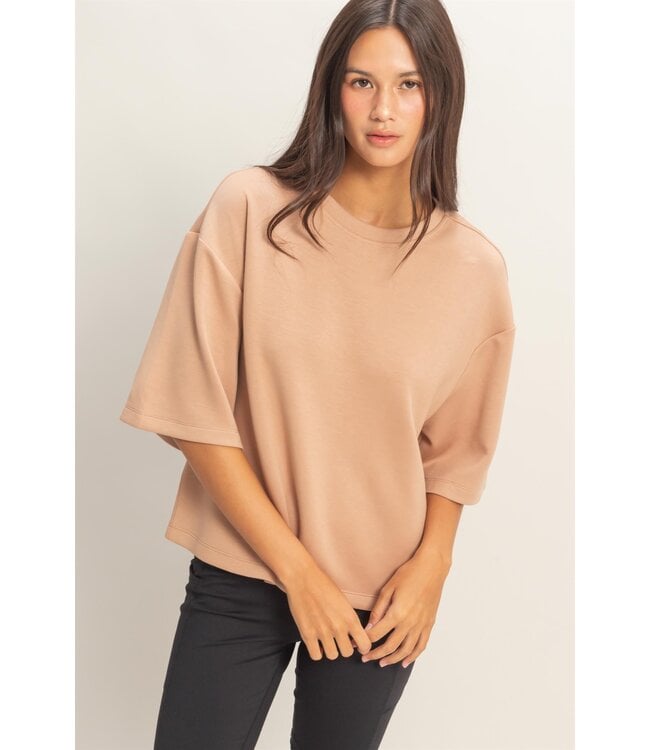Modern and minimal, the Samantha Dark Taupe Scuba Boxy Top is crafted from smooth double-knit fabric for a structured, wrinkle-resistant finish. Featuring a classic crew neckline and wide, half-length sleeves, this slightly cropped, boxy silhouette hits perfectly at the waist. Effortlessly chic, it pairs beautifully with high-waisted tailored trousers for a contemporary, elevated look.