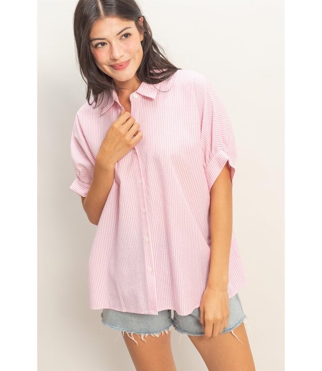 Bring effortless elegance to your wardrobe with the Summer Pink Striped Top, a breezy button-front blouse crafted from soft woven fabric. It features a crisp point collar, a full front placket, and short dolman sleeves subtly gathered at the cuffs for a delicate, feminine touch. Designed with an oversized, flowy silhouette and a gently curved hem, this blouse pairs perfectly with slim black trousers and sleek loafers for a polished yet relaxed look.