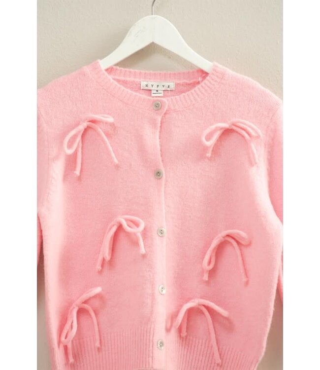 Sweet and cozy, the Zoe Pink Bow Cardigan Sweater features a soft pink knit adorned with bow details throughout for a charming, feminine look. Designed with long sleeves and delicate ruffle detailing at the wrists, this cardigan is perfect for adding a playful touch to any outfit.
