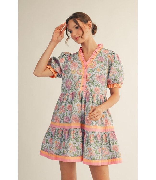 Say hello to the Carrie Sky Blue Tiered Floral Dress—sweet, breezy, and made to twirl. Featuring short puff sleeves, a tiered babydoll silhouette, and a charming floral print with solid contrast details, this button-front beauty is finished with ruffled neckline and sleeve accents (and yes… side pockets!).