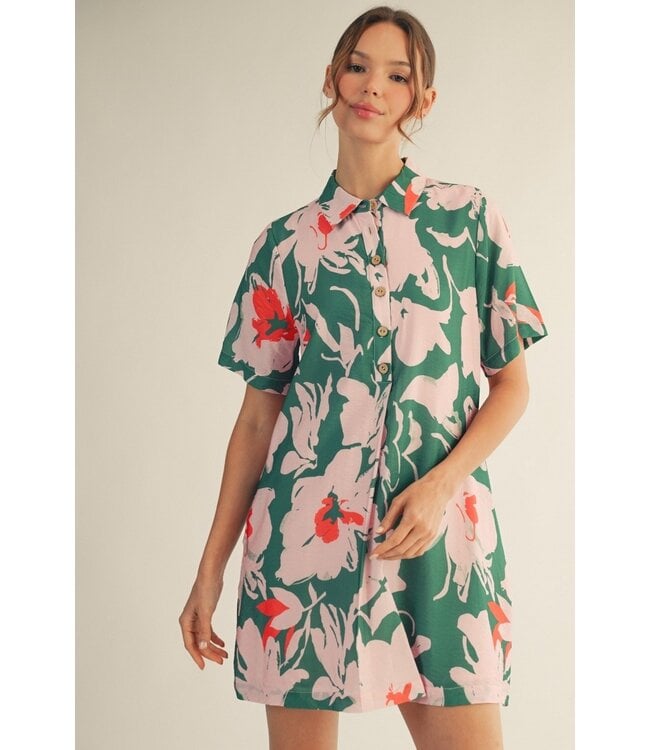 The Kylin Jade Tropical Floral Shirt Dress brings vibrant island energy with an effortless silhouette. Designed with short sleeves, a front button-up, and pleat detailing for easy movement, this tropical floral favorite is finished with side pockets for laid-back practicality.