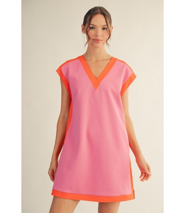 The Lainey Pink Contrast Dress is your new go-to for effortless style. Featuring a relaxed drop-shoulder fit, flattering V-neckline, and bold contrast accents, this solid dress is finished with side pockets and a subtle side-hem slit for easy movement.