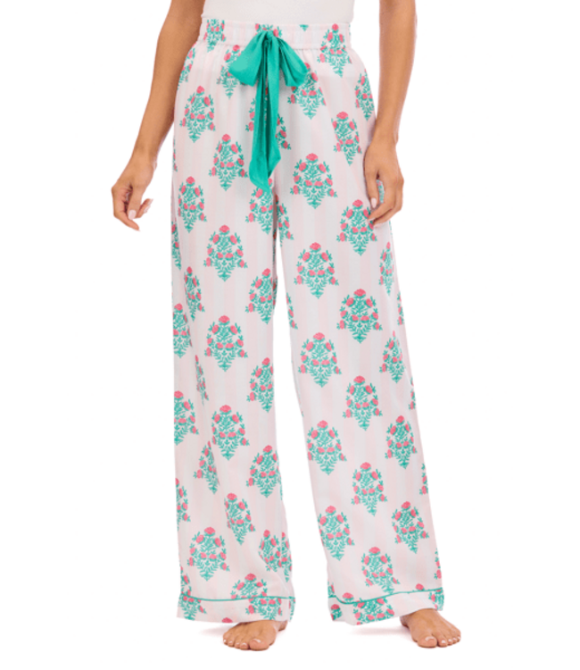 Enjoy soft, 100% polyester comfort with elegant piping and a bow-tie elastic waist for a customizable fit. With a 29" inseam (size small), these pants offer a flattering silhouette and easy-care durability—perfect for cozy nights or relaxing at home!