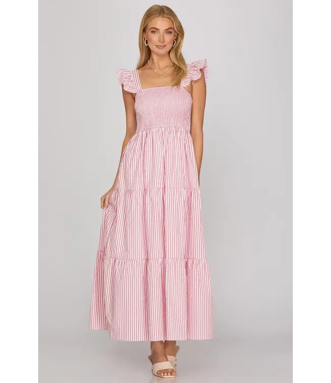 The Asia Pink Striped Maxi Dress is pure main-character energy! Featuring the sweetest ruffled sleeves and a flattering square neckline, this woven striped beauty is designed with a comfy smocked bodice and flowy tiered skirt that moves like a dream. Fully lined (no worries, girl!) and finished with pockets we absolutely love, this maxi is perfect for showers, brunch dates, or any moment you want to feel extra pretty and effortlessly put together.