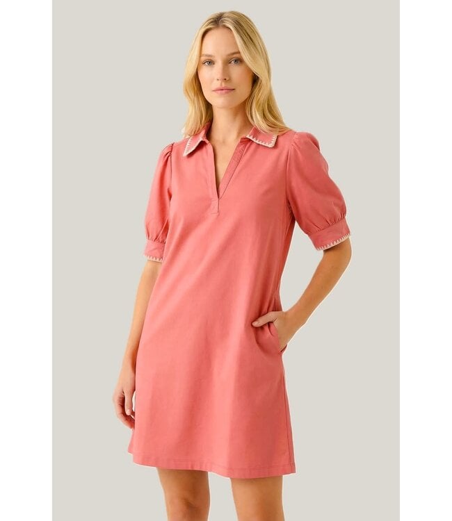 The Suzy Coral Scuba Dress is a playful, polished shift dress that effortlessly turns heads. Made from soft, structured scuba fabric, it features a classic Johnny collar, half puff sleeves, and delicate blanket-stitched edges for a touch of vintage charm. With practical pockets and a vibrant coral hue, this dress blends style and function, perfect for brunch dates, office chic, or weekend outings.