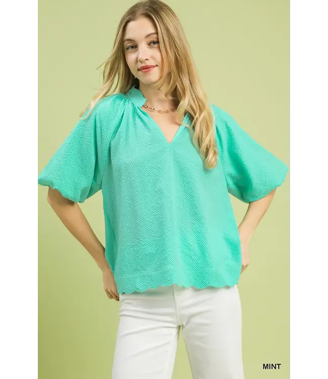 The Carol Mint Seersucker Top is the definition of sweet with a stylish twist. Made from classic seersucker fabric, this top feels light, breezy, and perfect for warm days ahead. The playful bubble sleeves add a soft, feminine touch, while the scalloped hemline brings all the charm we love in an everyday favorite. With sleeves lined for just the right amount of structure and comfort, Carol pairs perfectly with denim, skirts, or sunny-day smiles.