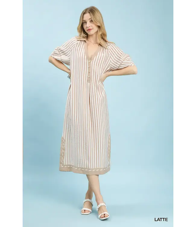 Breezy and effortlessly flattering, the Deb Latte Coastal Stripe Midi Dress is your go-to for warm, sun-soaked days. Designed with classic stripes and a relaxed silhouette, this midi features a soft V-neckline with a contrast placket and button detail that adds just the right touch of interest. Short sleeves keep it light and comfortable, while the side slit offers easy movement and a hint of allure. Unlined for an airy feel, it’s perfect for beach strolls, brunch dates, or casual evenings out.