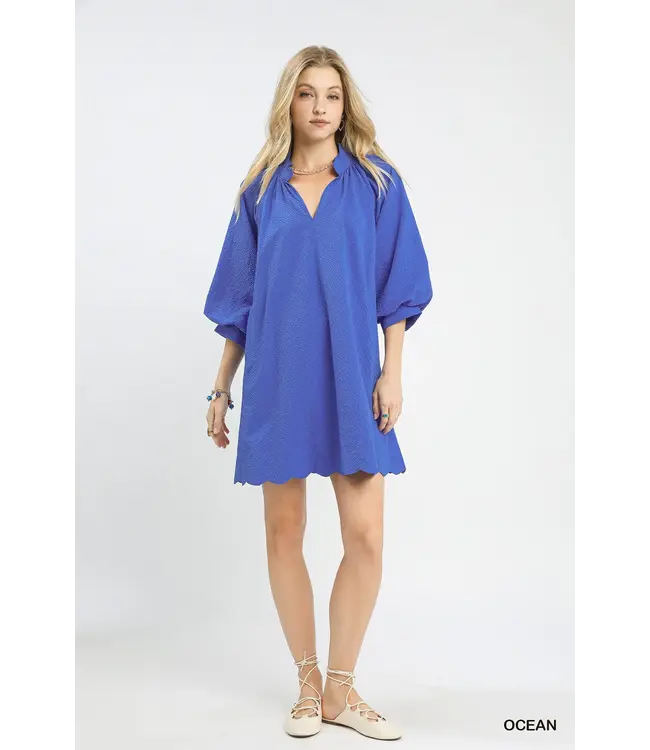 Glenda Ocean Textured Dress is the definition of effortlessly feminine charm. Designed with a flattering V-neckline adorned in soft scalloped trim, it adds a delicate, romantic touch to every look. The 3/4 length balloon sleeves bring a graceful, airy feel, while the textured fabric creates subtle dimension that catches the eye. Finished with convenient side pockets and a comfortable lining, this mini dress blends beauty with ease. Perfect for brunch dates, seaside strolls, or any moment you want to feel pretty and put together.