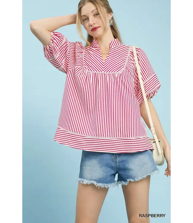 Cute, breezy, and full of personality, this striped babydoll top is your new everyday favorite. Designed with a flattering split V-neck and short puff sleeves, it features subtle contrast details that add just the right touch of interest. The relaxed, flowy fit keeps it light and feminine, perfect for styling up or down with ease.