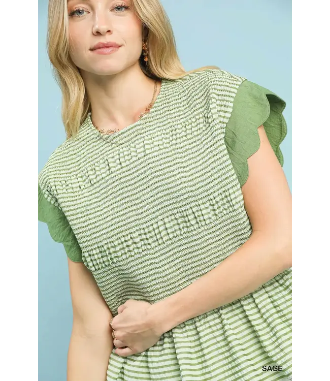 Sweet with a modern twist, the Katelyn Sage Stripe Peplum Top is an effortless way to elevate your everyday look. Designed with classic horizontal stripes, this top features a clean round neckline and short scallop-edge ruffle sleeves for a soft, feminine touch. The peplum silhouette creates a flattering shape with just the right amount of flow. Unlined and lightweight, it’s perfect for warm days and easy layering.