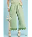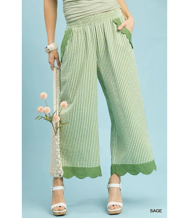 Easy, breezy, and full of charm, the Kimmy Sage Stripe Wide Leg Pants are a standout staple for warm-weather styling. Designed with flattering vertical pinstripes, these pants feature a comfortable elastic waistband for an effortless fit. Side pockets are finished with delicate ruffle trim, adding a playful touch, while the scalloped hem gives the silhouette a soft, feminine finish. Lightly lined through the short for comfortable coverage, they’re perfect for casual days or dressed-up moments alike.