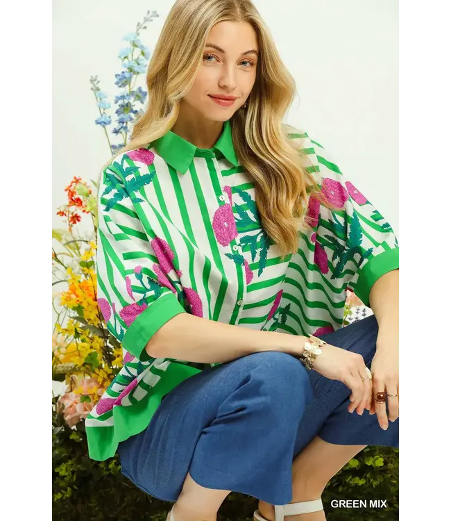 The Shelly Green Floral Stripe Top is your new girly go-to! With its charming mix of prints, relaxed drop shoulders, and flowy 3/4 sleeves, it’s equal parts comfy and cute. The scalloped hem adds the prettiest finishing touch for a look that’s simply irresistible.